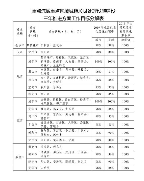 2017年4月,省政府辦公廳印發(fā)了《四川省城鎮(zhèn)污水處理設(shè)施建設(shè)三年推進(jìn)方案》和《四川省城鄉(xiāng)垃圾處理設(shè)施建設(shè)三年推進(jìn)方案》(川辦函〔2017〕85號(hào),以下簡(jiǎn)稱兩個(gè)三年推進(jìn)方案),各地按照兩個(gè)三年推進(jìn)方案,積極推進(jìn)城鎮(zhèn)污水和城鄉(xiāng)垃圾處理設(shè)施建設(shè),取得了積極成效。為加快推進(jìn)四川省城鎮(zhèn)污水和城鄉(xiāng)垃圾處理設(shè)施建設(shè),切實(shí)改善城鄉(xiāng)生態(tài)環(huán)境質(zhì)量,更好滿足人民群眾對(duì)美好環(huán)境的需求,省政府組織住房城鄉(xiāng)建設(shè)廳對(duì)兩個(gè)三年推進(jìn)方案作了修訂完善。經(jīng)省政府同意,現(xiàn)將修訂后的兩個(gè)三年推進(jìn)方案主要建設(shè)任務(wù)表、目標(biāo)任務(wù)表、重點(diǎn)流域重點(diǎn)區(qū)域目標(biāo)分解表及實(shí)施項(xiàng)目計(jì)劃表印發(fā)你們,并就有關(guān)事項(xiàng)通知如下。