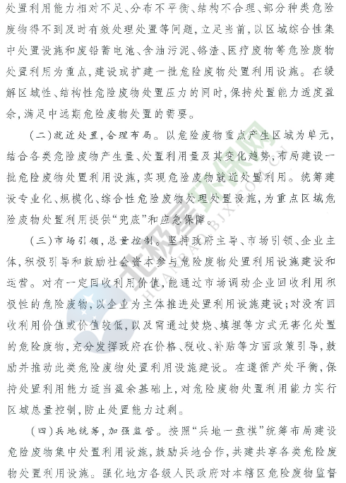 《指導(dǎo)意見》根據(jù)全區(qū)危險廢物產(chǎn)生、處置利用現(xiàn)狀和發(fā)展趨勢,以解決急需、兼顧長遠(yuǎn),就近處置、合理布局,市場引領(lǐng)、總量控制,兵地統(tǒng)籌、加強監(jiān)管為基本原則,通過優(yōu)化建設(shè)布局,擬用5年左右時間,解決目前全區(qū)危險廢物處置利用能力存在的結(jié)構(gòu)性、布局性和相對不足問題,使全區(qū)危險廢物集中處置利用能力不斷增強,處置利用設(shè)施布局趨于合理,基本滿足我區(qū)產(chǎn)生的各類危險廢物安全處置利用的需求,不斷提升全區(qū)危險廢物污染防治水平,降低環(huán)境風(fēng)險。
