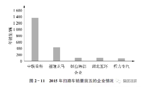 2015年全國銷售掃路車的前5企業(yè)合計銷售掃路車2094輛,在2015年全國掃路車總銷量(下同)中的份額達(dá)到85.16%。其中,中聯(lián)重科以1362輛的銷量(同比增長在24%以上)和55.39%的占有份額(同比下降0.42 %)高居行業(yè)榜首,該企業(yè)也是2015年全國銷售掃路車企業(yè)中唯一一家掃路車銷量超過1000輛且在1300輛以上的企業(yè),福建龍馬環(huán)衛(wèi)裝備累計銷量在430輛以上,同比增長91.56%,占有份額在17%以上,排名第二(詳見表2-11),其余企業(yè)累計銷量均在110輛以下。