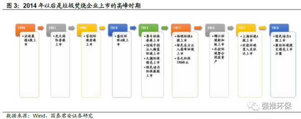 2014年及以后是我國垃圾焚燒企業(yè)上市的高峰時期。自1985年第一座垃圾焚燒廠在深圳建成,“十一五”期間垃圾焚燒行業(yè)開始發(fā)展,目前大部分項(xiàng)目是在2012年以后開始投運(yùn)。有了穩(wěn)定的運(yùn)營業(yè)績,垃圾焚燒的龍頭開始上市,除了光大國際、首創(chuàng)、北控、桑德等綜合型環(huán)保集團(tuán),2017年垃圾焚燒產(chǎn)能前22名的公司有10家是在2014年后上市或準(zhǔn)備上市。