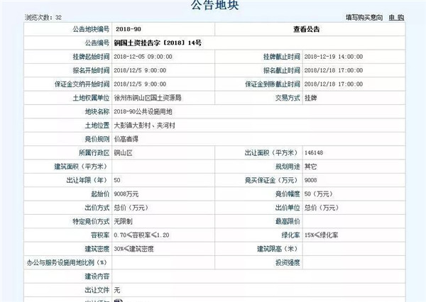 2018年11月15日,徐州市銅山區(qū)國(guó)土資源局發(fā)布國(guó)有土地使用權(quán)掛牌出讓公告銅國(guó)土資掛告字[2018]14號(hào),掛牌出售5塊地塊。其中包括2018-90號(hào)地塊。