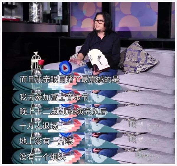 矮大緊老師曾在節(jié)目中提到過,自己去東京參加富士音樂節(jié),活動結(jié)束時讓他感到非常震撼,十萬人退場地上竟然沒有一點垃圾。更還有一些標(biāo)榜自己“個性十足”的粉絲在午夜排起長隊等候扔垃圾。