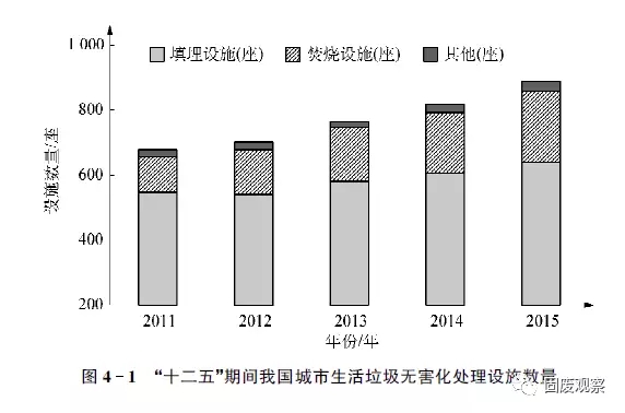 (1)填埋設(shè)施和處理量總體增長,總量占比有所下降