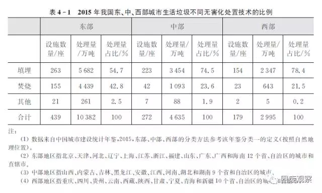 由表4-2可知,2015年我國東部地區(qū)填埋比例是81.8%,中部和西部地區(qū)填埋比例更高,分別是93.8%和92.6%,表明填埋仍然在縣城區(qū)域垃圾處理中占據(jù)著絕對(duì)主力位置。