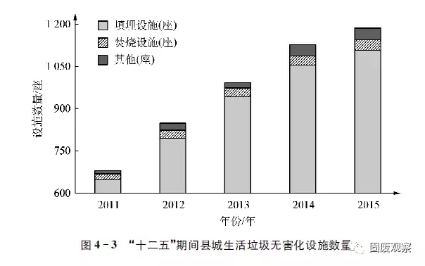 2015年全國縣級(jí)行政區(qū)域的無害化處理廠1187座,其中填埋設(shè)施1108座,比2014年新增53座,占全部縣級(jí)無害化處理設(shè)施的93.3%,從圖4-3可知,“十二五”期間縣城生活垃圾無害化處理設(shè)施建設(shè)得到快速發(fā)展。