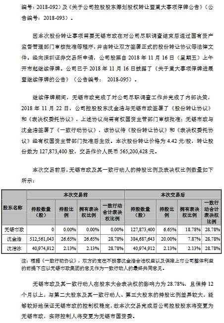 中金環(huán)境11月22日晚間公告,公司實際控制人沈金浩擬將1.28億股股份(占公司總股本的6.65%)轉(zhuǎn)讓給無錫市政,轉(zhuǎn)讓價格為4.42元/股,交易作價5.65億元。此外,沈金浩擬通過表決權(quán)委托方式將剩余股份中2.33億股股份對應的表決權(quán)委托給無錫市政,占公司總股本的12.13%。交易完成后公司控股股東將變更為無錫市政,實際控制人將變更為無錫市國資委。公司股票將于11月23日復牌。