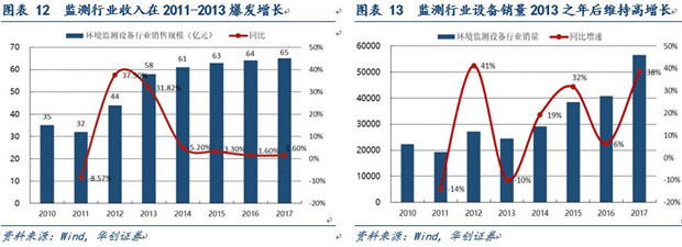 從監(jiān)測設(shè)備的細(xì)分領(lǐng)域來看,空氣質(zhì)量監(jiān)測設(shè)備歷史上經(jīng)歷了兩個(gè)高增長期,第一次爆發(fā)性增長為2011-2012年,復(fù)合增速高達(dá)197.3%,第二次出現(xiàn)在2015年,增速為161.7%,這次增長的主要原因是2016年1月1日后要實(shí)施修訂后的《中華人民共和國大氣污染防治法》,其中規(guī)定各省大氣污染防治重點(diǎn)任務(wù)完成情況將納入考核,刺激政府需求;此外煙塵煙氣設(shè)備行業(yè)則是從2011年開始維持穩(wěn)定的增長持續(xù)到2017年,期間復(fù)合增長率14.9%;水質(zhì)監(jiān)測設(shè)備行業(yè)發(fā)展較晚,在2017年設(shè)備銷量猛增86%,達(dá)到19345套。