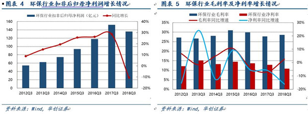 2018Q3,環(huán)保上市公司營業(yè)總收入為1369.04億元,同比增加83.37億元,增幅6.48%,增速與去年相比大幅回落。歸屬于母公司的凈利潤147.77億元,同比減少17.67億元,下降10.68%??鄢墙?jīng)常性損益后的歸母凈利潤共136.04億元,同比減少16.05億元,下降10.55%,與去年同期28.61%的增幅相比大幅下跌。行業(yè)整體毛利率為28.51%,同比增加2.62個(gè)百分點(diǎn),在近幾年毛利率下滑的趨勢中有所回升,但整體凈利率為10.79%,同比減少16.12個(gè)百分點(diǎn),說明毛利率的回升沒有帶來凈利率的增加。