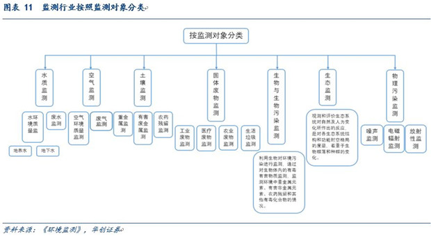 環(huán)境監(jiān)測行業(yè)按照監(jiān)測對象分類,可分為水質(zhì)監(jiān)測、空氣監(jiān)測、土壤監(jiān)測、固體廢物監(jiān)測、生物監(jiān)測與生物污染監(jiān)測、生態(tài)監(jiān)測和物理污染監(jiān)測。而每個(gè)子板塊可以進(jìn)一步劃分為環(huán)境質(zhì)量監(jiān)測和污染源監(jiān)測,以空氣監(jiān)測為例,可以劃分為空氣環(huán)境質(zhì)量監(jiān)測和廢氣監(jiān)測,前者主要監(jiān)測環(huán)境中污染物的分布和濃度,以確定環(huán)境質(zhì)量狀況;后者的主要目的是控制有害物質(zhì)的排放量。對于不同的監(jiān)測領(lǐng)域和監(jiān)測目的也有相對應(yīng)的不同監(jiān)測設(shè)備,大氣監(jiān)測設(shè)備可以分為CO、SO2、NOX、O3、PM10、PM2.5、顆粒物監(jiān)測設(shè)備等,大型監(jiān)測點(diǎn)如國控點(diǎn)、省控點(diǎn)包含以上多個(gè)模塊,而網(wǎng)格化布點(diǎn)的小型化監(jiān)測設(shè)備主要用于監(jiān)測以PM2.5為主的單項(xiàng)指標(biāo)。