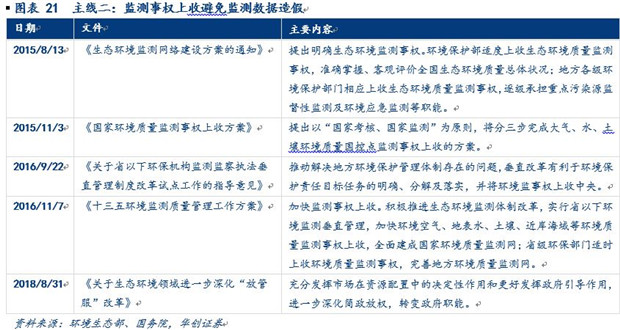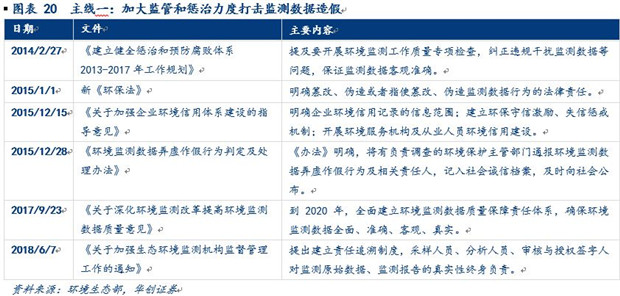 第三階段:政策推動集中打擊監(jiān)測數(shù)據(jù)造假。2015年以來,整體上監(jiān)測設(shè)備廣泛布局和補(bǔ)充升級的過程已經(jīng)基本結(jié)束,后續(xù)增長有限,實(shí)施執(zhí)行過程中暴露出篡改、虛報(bào)數(shù)據(jù)等諸多問題才是該階段的主要問題,因而規(guī)范監(jiān)測數(shù)據(jù)、打擊數(shù)據(jù)造假成為本階段主題。從政策來看,打擊數(shù)據(jù)造假的執(zhí)行過程中有兩條主線:第一條主線貫穿始終,從2015年1月1日《新環(huán)保法》頒布以來,又陸續(xù)出臺實(shí)施指導(dǎo)意見通過明確責(zé)任、建立懲罰機(jī)制加大監(jiān)測數(shù)據(jù)造假的成本,用嚴(yán)監(jiān)管的方式打擊監(jiān)測數(shù)據(jù)造假;第二條主線則是對主線一的補(bǔ)充和優(yōu)化,從2015年8月開始,通過監(jiān)測事權(quán)上收、調(diào)整監(jiān)管體系架構(gòu),從根源上用疏通的方式來避免監(jiān)測數(shù)據(jù)造假的問題。