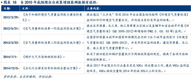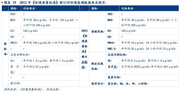 對監(jiān)測數(shù)據(jù)要求提升從政策看來主要表現(xiàn)在兩個(gè)方面:(1)擴(kuò)大監(jiān)測指標(biāo)范圍+縮緊合格要求。早在2012 年環(huán)保部頒布新版《環(huán)境空氣質(zhì)量標(biāo)準(zhǔn)》中普遍實(shí)施的指標(biāo)中新增PM2.5,部分區(qū)域?qū)嵤┑闹笜?biāo)中新增了氮氧化物,并新增推薦項(xiàng)目鎘、汞、砷、六價(jià)鉻,擴(kuò)大了環(huán)境監(jiān)測數(shù)據(jù)的覆蓋范圍;同時(shí)對NO2、PM10、鉛、苯并芘等已有監(jiān)測指標(biāo)的合格要求也變得更加嚴(yán)格。而該標(biāo)準(zhǔn)的實(shí)施細(xì)則在2013年3月頒布并廣泛實(shí)行。2014年又進(jìn)一步出臺對大氣和石化行業(yè)的細(xì)分要求,提高對排放限值的規(guī)定。(2)管理+采集雙管齊下提升數(shù)據(jù)真實(shí)性。自2012年出臺的《關(guān)于加強(qiáng)環(huán)境空氣質(zhì)量監(jiān)測能力建設(shè)的意見》開始提出要通過健全審核機(jī)制、提高公布數(shù)據(jù)的頻率等管理手段來加強(qiáng)環(huán)境監(jiān)測數(shù)據(jù)的有效性,提出共享數(shù)據(jù)的概念,并制定“三步走”的執(zhí)行方案,系列政策一直持續(xù)到2013年底。