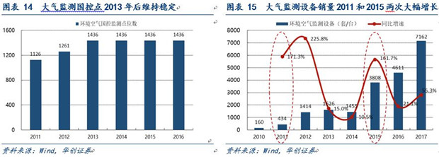 第一階段:建設(shè)監(jiān)測體系,國控點(diǎn)、省控點(diǎn)等大型監(jiān)測設(shè)備廣泛布局。第一階段從2011年開始到2013年結(jié)束,首先這是環(huán)境監(jiān)測行業(yè)在各省市普及化布局監(jiān)測點(diǎn)位,集中發(fā)展的重要階段。從監(jiān)測行業(yè)營收來看,行業(yè)銷售規(guī)模從32億元猛增到58億元,兩年內(nèi)的同比增速在30%以上,復(fù)合增速高達(dá)34.6%,而期間監(jiān)測設(shè)備銷量的增長率為12.8%,該階段主要由于采購的主要為大型監(jiān)測站,價(jià)值量較高,所以營收增速高于設(shè)備銷售增速;隨著2013年大型監(jiān)測站基本布局完成,大氣監(jiān)測國控點(diǎn)的數(shù)目基本穩(wěn)定在1436個(gè),此后監(jiān)測設(shè)備銷售主要用于補(bǔ)充配置,銷量增速高于行業(yè)營收增速。
