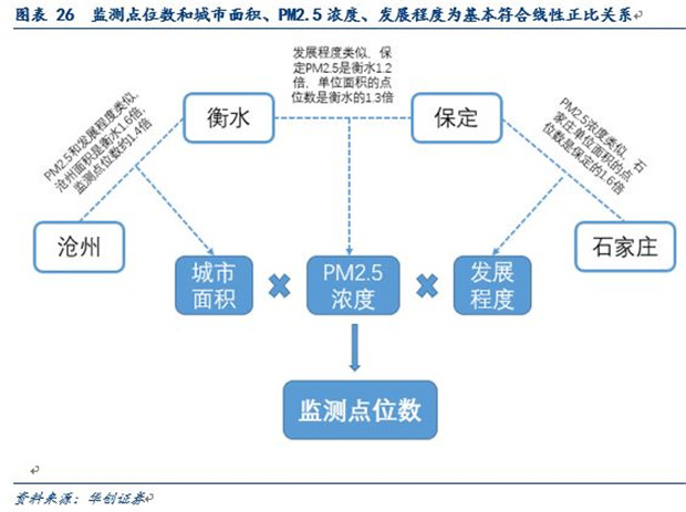 從布點(diǎn)的個(gè)數(shù)來看,污染嚴(yán)重、面積大、經(jīng)濟(jì)發(fā)達(dá)的地級市布點(diǎn)更為密集。以河北為例,滄州市和衡水市的污染程度差不多,同作為非省會的地級市發(fā)展程度也類似,而滄州市的面積是衡水的1.6倍,而滄州的監(jiān)測點(diǎn)位數(shù)為衡水的近1.4倍,所以可以認(rèn)為布點(diǎn)個(gè)數(shù)和面積基本為線性正比;而比較保定市和衡水市,保定市是衡水市面積的2.5倍,發(fā)展程度相似,但折算后的單位面積的點(diǎn)位數(shù)保定仍是衡水的1.3倍,這是因?yàn)楸6ǖ腜M2.5濃度是衡水的1.2倍,所以可以認(rèn)為監(jiān)測點(diǎn)位數(shù)和PM2.5濃度基本符合線性正比關(guān)系;而對于保定和石家莊,兩者的污染程度類似,保定市的面積是石家莊的1.6倍,但布局的監(jiān)測點(diǎn)位數(shù)差不多,可以發(fā)現(xiàn)經(jīng)濟(jì)發(fā)達(dá)地區(qū)/省會城市的網(wǎng)格化監(jiān)測點(diǎn)位數(shù)會存在一個(gè)放大倍數(shù)。