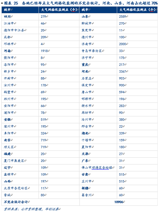 2017 年以來我國大氣網(wǎng)格化監(jiān)測訂單總額超過7億元,招標(biāo)主體涉及河北、河南、山東、陜西、天津、福建、廣東、廣西、安徽、四川、江蘇、甘肅、湖北、新疆與遼寧這 15 個(gè)省級行政區(qū),39個(gè)地級市。經(jīng)不完全統(tǒng)計(jì)全國大氣網(wǎng)格化監(jiān)測布點(diǎn)10906個(gè),其中河北、山東、河南布點(diǎn)數(shù)目全國前三,涉及23個(gè)城市,合計(jì)7874個(gè)點(diǎn)位,占全國總布點(diǎn)數(shù)目70%以上。而且三大省份已經(jīng)布局的這23個(gè)城市中有18個(gè)都屬于《京津冀及周邊地區(qū)2017年大氣污染防治工作方案》中明確的“2+26”通道城市,其中河北省的8個(gè)通道城市,石家莊、唐山、廊坊、保定、滄州、衡水、邢臺、邯鄲全部實(shí)現(xiàn)網(wǎng)格化監(jiān)測覆蓋;山東省的7個(gè)通道城市中,濟(jì)南、濟(jì)寧、德州、聊城已經(jīng)布點(diǎn)并統(tǒng)計(jì)在內(nèi),淄博已經(jīng)完成布點(diǎn)但沒有準(zhǔn)確數(shù)據(jù),濱州和菏澤在尚布局中;河南省的7個(gè)通道城市中,鄭州、開封、安陽、鶴壁、新鄉(xiāng)、濮陽已經(jīng)完成布點(diǎn),只有焦作尚在布局中。外加北京、天津、山西省的太原和晉城也完成網(wǎng)格監(jiān)測點(diǎn)布局,“2+26”城市中有22個(gè)已經(jīng)布點(diǎn),基本實(shí)現(xiàn)了城市的覆蓋,但從布點(diǎn)數(shù)量來看河北廊坊市、山東濟(jì)寧市、聊城市、河南省各市以及天津只是剛剛開始,這些城市離布局完成還有近80%的空間。