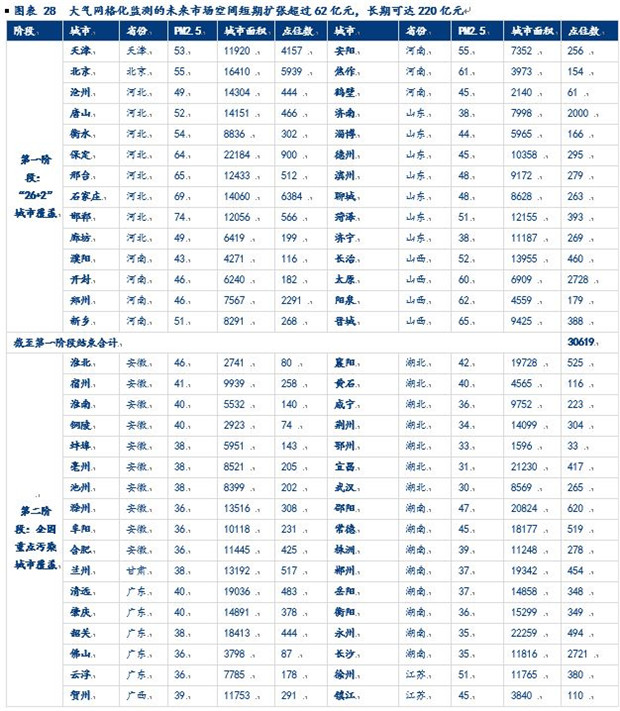 大氣網(wǎng)格化監(jiān)測布點(diǎn)從“26+2”城市開始,并從重污染地區(qū)向輕污染地區(qū)延伸的拓展,直到覆蓋全國。第一階段是“26+2”城市覆蓋階段,預(yù)計(jì)總共布點(diǎn)約30619個(gè),形成30億左右的市場;第二階段是全國重點(diǎn)污染城市覆蓋階段,預(yù)計(jì)點(diǎn)位91943個(gè),市場空間擴(kuò)張到92億元;第三階段是全國337個(gè)地級市全覆蓋階段,預(yù)計(jì)點(diǎn)位220758個(gè),市場空間超過220億元。