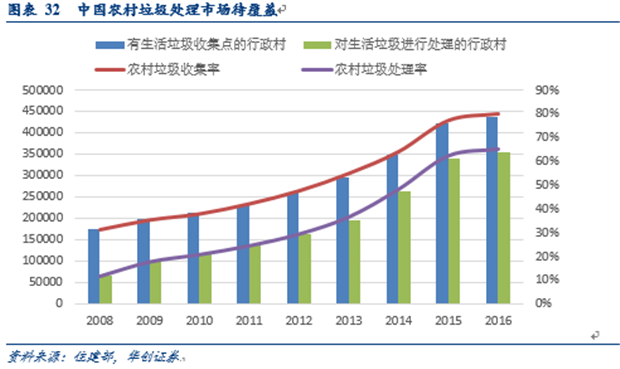 2016年,國務(wù)院印發(fā)的《“十三五”生態(tài)環(huán)境保護(hù)規(guī)劃》提出的目標(biāo):實(shí)現(xiàn)90%以上村莊的生活垃圾得到有效治理,推進(jìn)垃圾處理設(shè)施和服務(wù)向農(nóng)村延伸,新增完成對13萬個(gè)建制村完成環(huán)境綜合整治。