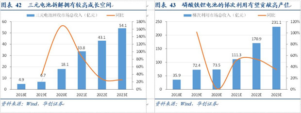 而從產(chǎn)值來看,三元電池回收企業(yè)主要以拆解提純正極材料再出售為主要業(yè)務(wù),而磷酸鐵鋰電池則主要應(yīng)用于梯次利用。根據(jù)未來動力電池回收量,我們預(yù)計(jì)動力電池兩種回收形態(tài)有望在2020-2021年擁有超百億的市場空間,且未來仍有望保持較高增長。