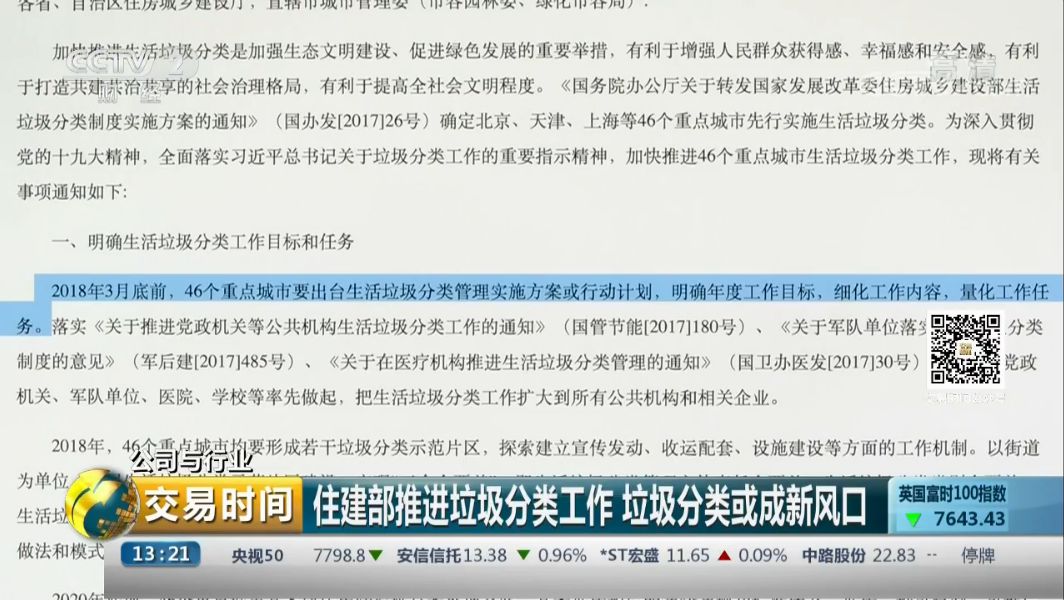 隨著2017年成為環(huán)保政策爆發(fā)年之后,環(huán)保板塊活躍度一度攀升,其中2017年7月18日至10月13日,指數(shù)上漲17.09%,跑贏同期上證綜指10.35個百分點(diǎn)。2017年底,住建部發(fā)文要求加快推進(jìn)46個重點(diǎn)城市的工作。那么垃圾的分類回收、處理會給企業(yè)帶來哪些新的商機(jī)呢?住建部推進(jìn)垃圾分類工作 垃圾分...