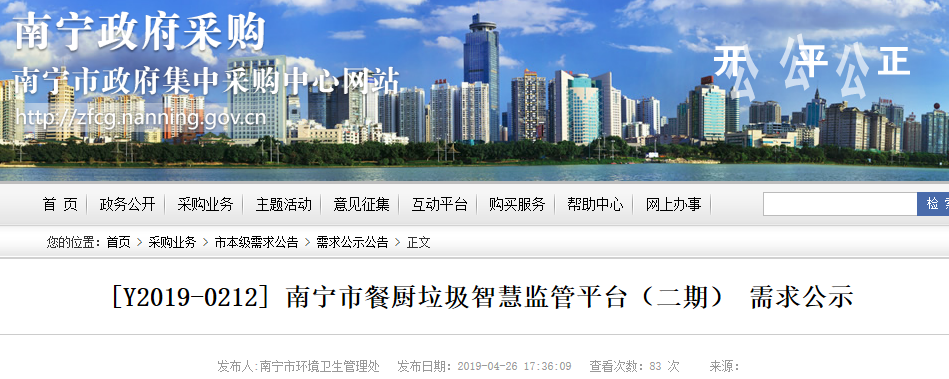 中國(guó)環(huán)聯(lián)網(wǎng)獲悉,4月26日,廣西南寧市餐廚垃圾智慧監(jiān)管平臺(tái)(二期)發(fā)布需求公示,項(xiàng)目預(yù)算總價(jià)572.57萬(wàn)元。為保障政府采購(gòu)各方當(dāng)事人的合法權(quán)益,確保政府采購(gòu)公開(kāi)、公平、公正。擬對(duì)南寧市餐廚垃圾智慧監(jiān)管平臺(tái)(二期) 進(jìn)行公開(kāi)招標(biāo) 。現(xiàn)將采購(gòu)需求進(jìn)行公示,征詢(xún)各潛在供應(yīng)商的意見(jiàn)。1、項(xiàng)目預(yù)公示編號(hào):Y...