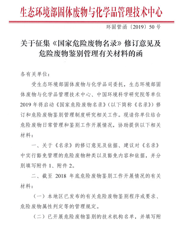 關(guān)于征集《國家危險廢物名錄》修訂意見及危險廢物鑒別管理有關(guān)材料的函原標題:關(guān)于征集《國家危險廢物名錄》修訂意見及危險廢物鑒別管理有關(guān)材料的函