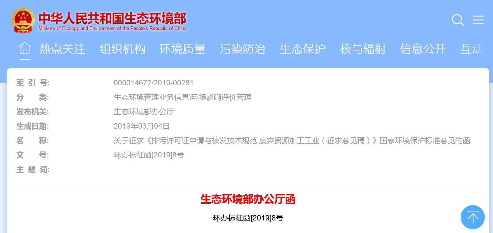關(guān)于征求《排污許可證申請與核發(fā)技術(shù)規(guī)范 廢棄資源加工工業(yè)(征求意見稿)》國家環(huán)境保護標(biāo)準(zhǔn)意見的函生態(tài)環(huán)境部辦公廳函環(huán)辦標(biāo)征函[2019]8號關(guān)于征求《排污許可證申請與核發(fā)技術(shù)規(guī)范 廢棄資源加工工業(yè)(征求意見稿)》國家環(huán)境保護標(biāo)準(zhǔn)意見的函各有關(guān)單位:為落實《國務(wù)院辦公廳關(guān)于印發(fā)控制污染物排放許可制實施...
