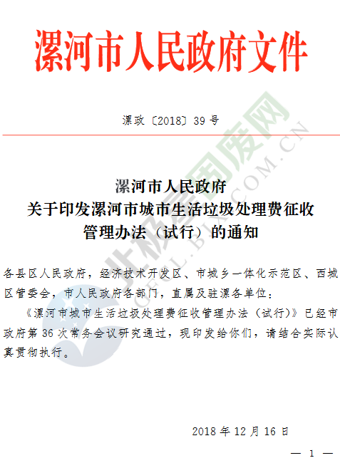 日前,《漯河市城市生活垃圾處理費征收管理辦法(試行)》已經(jīng)河南漯河市政府第36次常務(wù)會議研究通過,并于2019年1月1日起試行?!朵鸷邮谐鞘猩罾幚碣M征收管理辦法(試行)》是對《漯河市城市生活垃圾處理費計收管理暫行辦法》(漯政〔2005〕73號)的完善修訂。具體內(nèi)容如下:漯河市城市生活垃圾處理費...
