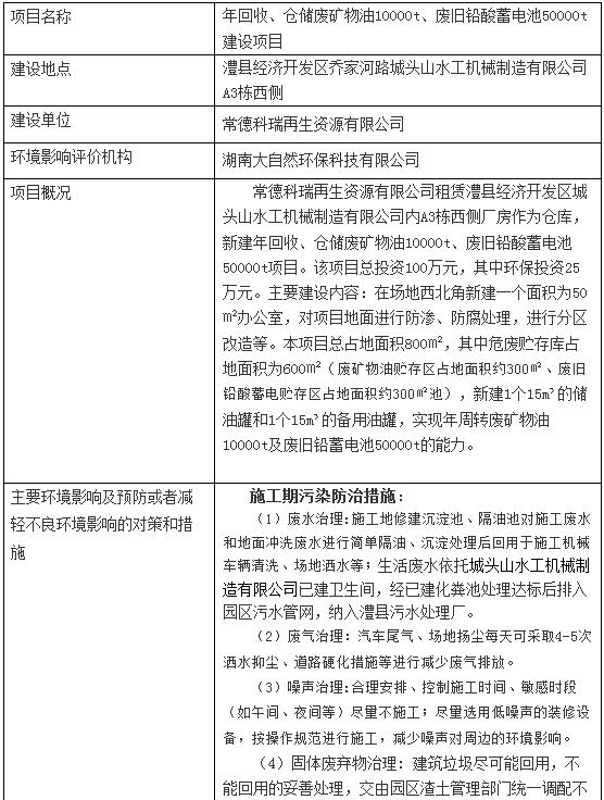 日前,湖南澧縣對(duì)年回收、倉(cāng)儲(chǔ)廢礦物油10000t、廢舊鉛酸蓄電池50000t建設(shè)項(xiàng)目環(huán)境影響報(bào)告表進(jìn)行擬審批公示,詳情如下:年回收、倉(cāng)儲(chǔ)廢礦物油10000t、廢舊鉛酸蓄電池50000t建設(shè)項(xiàng)目環(huán)境影響報(bào)告表擬審批公示經(jīng)審議,我局?jǐn)M于近日內(nèi)批準(zhǔn)《年回收、倉(cāng)儲(chǔ)廢礦物油10000t、廢舊鉛酸蓄電池5000...