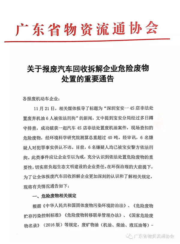 近日,廣東省物質(zhì)流通協(xié)會(huì)發(fā)布了《關(guān)于報(bào)廢汽車回收拆解企業(yè)危險(xiǎn)廢物處置的重要通告》。具體內(nèi)容如下:原標(biāo)題:關(guān)于報(bào)廢汽車回收拆解企業(yè)危險(xiǎn)廢物處置的重要通告