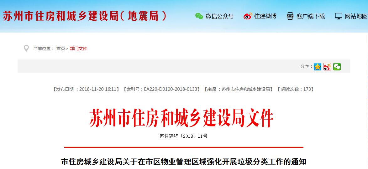 日前,蘇州市住建局發(fā)布了關(guān)于在市區(qū)物業(yè)管理區(qū)域強(qiáng)化開展垃圾分類工作的通知,詳情如下:各區(qū)住建局,姑蘇區(qū)住建委,蘇州工業(yè)園區(qū)規(guī)建委;各物業(yè)服務(wù)企業(yè):蘇州是全國首批26個(gè)生活垃圾分類示范城市(區(qū))之一,推進(jìn)垃圾分類,既是衡量城市文明程度的重要指標(biāo),也是建設(shè)美麗宜居名城的內(nèi)在要求。去年,市政府辦公室印發(fā)了...