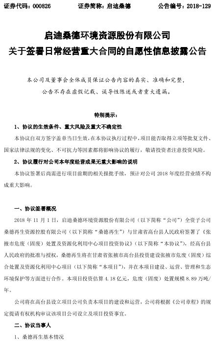 啟迪桑德日前公告,公司全資子公司桑德再生與甘肅省高臺(tái)縣人民政府簽署協(xié)議,桑德再生將在甘肅省張掖市高臺(tái)縣投資建設(shè)張掖市危廢(固廢)綜合處置及資源化利用中心項(xiàng)目,并在項(xiàng)目建設(shè)、運(yùn)營、管理和生態(tài)環(huán)境保護(hù)等方面進(jìn)行合作。該項(xiàng)目投資估算4.18億元,危廢(固廢)處置規(guī)模8.89萬噸/年。公告如下:延伸閱讀:青...