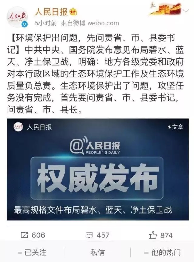 昨日,人民日報(bào)發(fā)布《這件事,習(xí)近平視為“根本大計(jì)”》、《環(huán)境保護(hù)腰桿硬起來》、《中央環(huán)保督察嚴(yán)禁“表面整改”》等數(shù)篇文章。而近日,中央紀(jì)委則首次集中通報(bào)了生態(tài)責(zé)任追究的典型問題。在第47個(gè)世界環(huán)境日,以如此猛烈的方式表達(dá)對環(huán)境的關(guān)注,無疑在釋放嚴(yán)肅查處破壞環(huán)境違紀(jì)違法行為的強(qiáng)烈信號,表明了中央對治理...