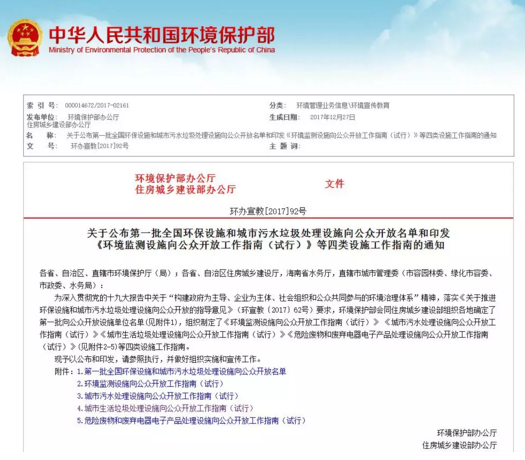 近日環(huán)保部發(fā)布了關(guān)于公布第一批全國(guó)環(huán)保設(shè)施和城市污水垃圾處理設(shè)施向公眾開(kāi)放名單和印發(fā)《環(huán)境監(jiān)測(cè)設(shè)施向公眾開(kāi)放工作指南(試行)》等四類(lèi)設(shè)施工作指南的通知。 包括29個(gè)垃圾處理設(shè)施,其中垃圾焚燒設(shè)施21個(gè),垃圾填埋設(shè)施6個(gè),餐廚垃圾處理設(shè)施1個(gè),滲濾液處理設(shè)施1個(gè),分布于全國(guó)27個(gè)省、直轄市和自治區(qū),聯(lián)...