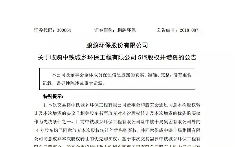 鵬鷂環(huán)保:擬收購(gòu)中鐵環(huán)保51%股權(quán)并對(duì)其增資