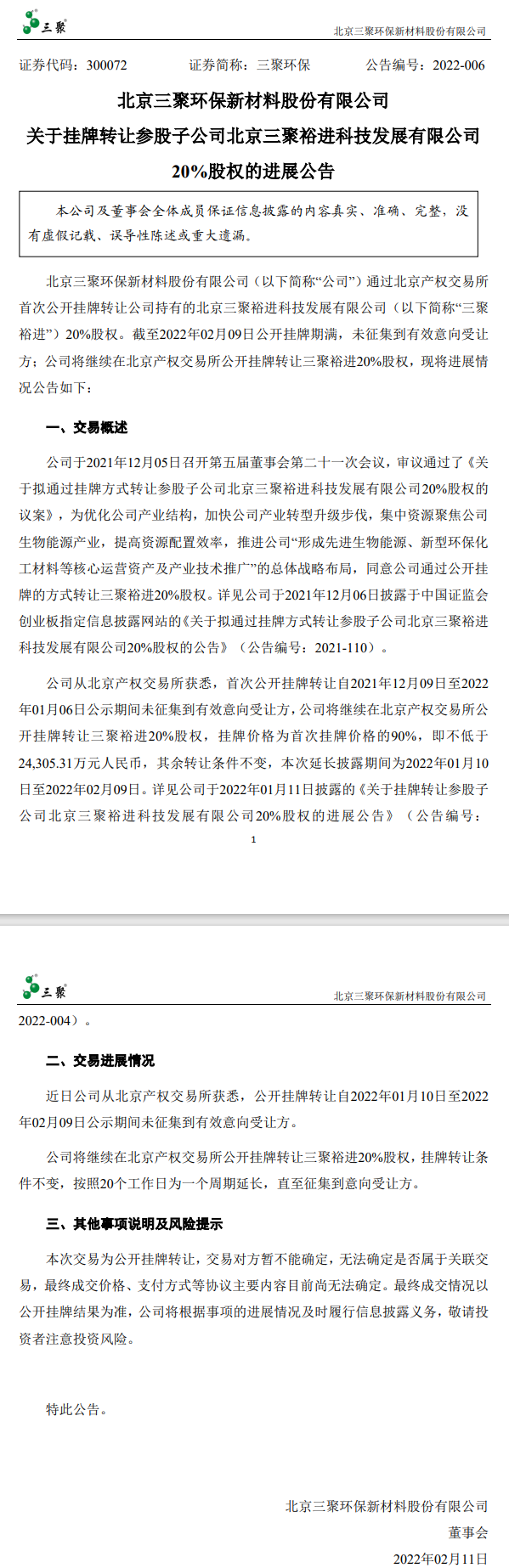 2022年2月11日,北京三聚環(huán)保新材料股份有限公司發(fā)布《關(guān)于掛牌轉(zhuǎn)讓參股子公司北京三聚裕進(jìn)科技發(fā)展有限公司20%股權(quán)的進(jìn)展公告》。 公告顯示,自2021年12月09日,截至2022年02月09日公開(kāi)掛牌期滿,參股子公司北京三聚裕進(jìn)科技發(fā)展有限公司20%股權(quán)在北京產(chǎn)權(quán)交易所公開(kāi)掛牌未征集到有效意向受...
