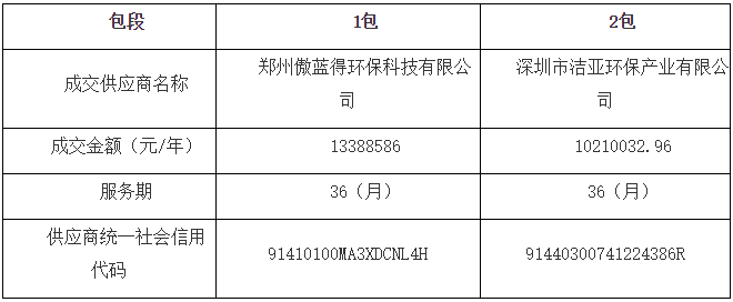 湖北省監(jiān)利縣城區(qū)環(huán)衛(wèi)作業(yè)市場化項目發(fā)布評標(biāo)結(jié)果公示,鄭州傲藍得環(huán)??萍加邢薰精@得1包,中標(biāo)金額1339萬/年,服務(wù)期限36個月。 具體中標(biāo)信息如下: 附項目信息: 服務(wù)內(nèi)容:監(jiān)利城區(qū)清掃保潔、生活垃圾收集運輸、公廁保潔維護、水域保潔、中轉(zhuǎn)站管理、牛皮癬清理。 第1包: (1)項目包編號:1包 (2...