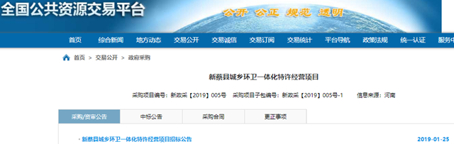 河南省新蔡縣城鄉(xiāng)環(huán)衛(wèi)一體化特許經(jīng)營項目發(fā)布單一來源采購招標(biāo)公告,擬推薦中國光大國際有限公司下屬光大生態(tài)資源(深圳)有限公司為項目供應(yīng)商。 擬采購內(nèi)容:彌陀寺鄉(xiāng)、龍口鎮(zhèn)、韓集鎮(zhèn)、孫召鎮(zhèn)、李橋鎮(zhèn)、櫟城鄉(xiāng)、棠村鎮(zhèn)、宋崗鄉(xiāng)、關(guān)津鄉(xiāng)、河塢鄉(xiāng)、佛閣寺鎮(zhèn)、余店鎮(zhèn)、陳店鎮(zhèn)、磚店鎮(zhèn)、黃樓鎮(zhèn)、澗頭鄉(xiāng)、化莊鄉(xiāng)、楊莊戶鄉(xiāng)、...