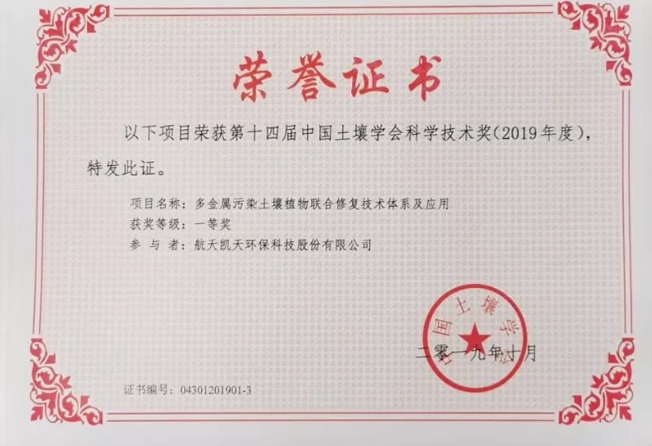 2019年10月,經(jīng)中國土壤學(xué)會項目評選委員會評審決定,航天凱天環(huán)??萍脊煞萦邢薰九c中山大學(xué)、廣東省耕地肥料總站聯(lián)合申報的“多金屬污染土壤植物聯(lián)合修復(fù)技術(shù)體系及應(yīng)用”獲中國土壤學(xué)會科學(xué)技術(shù)獎一等獎。 該技術(shù)體系將航天凱天環(huán)保自主研發(fā)的重金屬土壤修復(fù)技與中山大學(xué)研發(fā)的多金屬污...