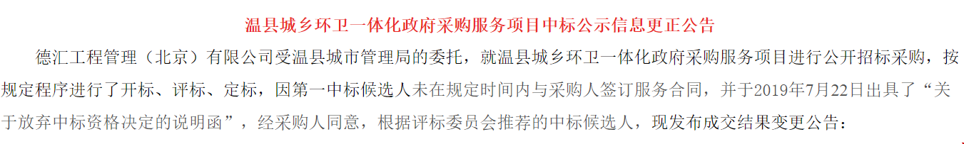 7月30日,河南省焦作市溫縣城鄉(xiāng)環(huán)衛(wèi)一體化項(xiàng)目中標(biāo)信息更正公告發(fā)布,因第一中標(biāo)候選人錦江生態(tài)未在規(guī)定時(shí)間內(nèi)與采購(gòu)人簽訂服務(wù)合同,并在7月22日出具了“關(guān)于放棄中標(biāo)資格決定的說(shuō)明函”,經(jīng)采購(gòu)人同意,中標(biāo)供應(yīng)商由錦江生態(tài)變更大連明日環(huán)境,中標(biāo)價(jià)格也由5042元/年,變?yōu)?165元/年。具體如下:原中標(biāo)信...