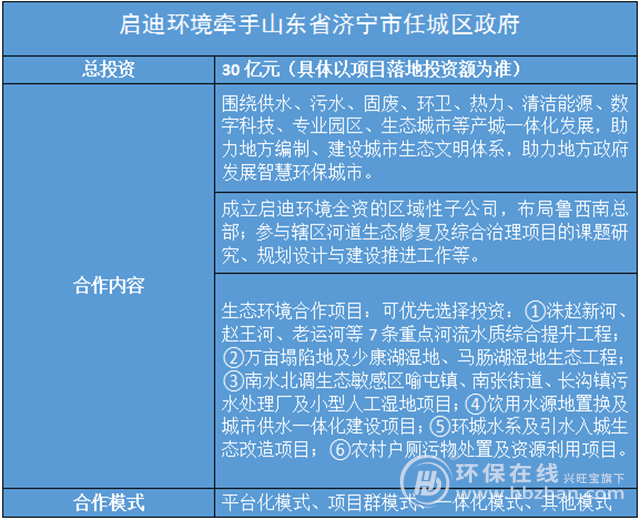 近日,啟迪環(huán)境公告稱公司與山東省濟(jì)寧市任城區(qū)政府簽署合作框架協(xié)議,雙方將對(duì)生態(tài)體系建設(shè)重點(diǎn)項(xiàng)目進(jìn)行合作,包括河流水質(zhì)綜合提升工程、濕地生態(tài)工程、飲用水源地置換及城市供水一體化建設(shè)項(xiàng)目等6個(gè)生態(tài)環(huán)境項(xiàng)目,預(yù)計(jì)總投資約30億元。具體如下圖: 任城區(qū)是山東濟(jì)寧市的核心區(qū),能源富集,產(chǎn)業(yè)發(fā)達(dá),目前正籌備構(gòu)建...