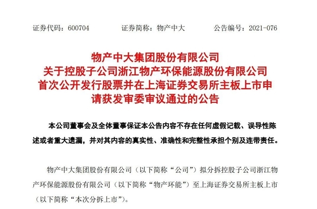 2021年9月30日,物產(chǎn)中大發(fā)布關(guān)于控股子公司浙江物產(chǎn)環(huán)保能源有限公司首次公開發(fā)行股票,并在上海證券交易所主板上市申請(qǐng)獲發(fā)審委審議通過的公告。 公告顯示,物產(chǎn)中大集團(tuán)股份有限公司(以下簡稱“公司”)擬分拆控股子公司浙江物產(chǎn)環(huán)保能源股份有限公司(以下簡稱“物產(chǎn)環(huán)能...