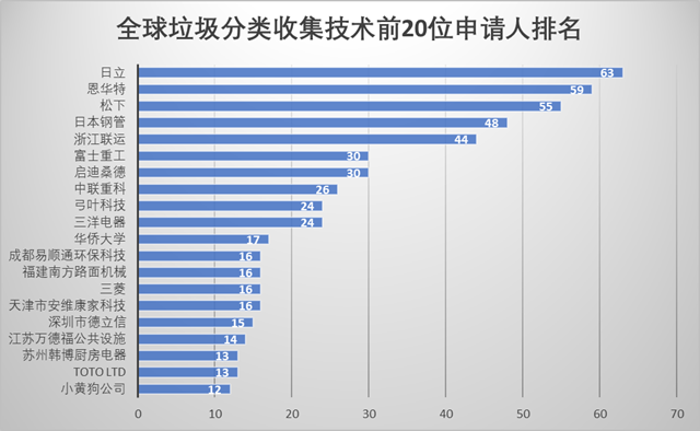 在全球垃圾收集分類領(lǐng)域?qū)@暾?qǐng)量排名前20的申請(qǐng)人中,日立作為世界五百強(qiáng)綜合跨國集團(tuán)在多個(gè)領(lǐng)域處于行業(yè)領(lǐng)先地位,與專注于垃圾處理技術(shù)并發(fā)明了第一套自動(dòng)垃圾收集系統(tǒng)的瑞典恩華特并駕齊驅(qū),緊隨其后的是另一家世界五百強(qiáng)企業(yè)松下。浙江聯(lián)運(yùn)、啟迪桑德、以及成立于2018年并致力于將人工智能和大數(shù)據(jù)技術(shù)應(yīng)用于垃...